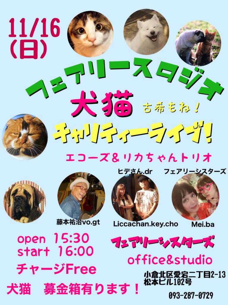 11月はのんびりと、11/16日曜日 小倉の愛宕にあるフェアリースタジオで、犬猫チャリティーライブ、and古希もね‼️をリカちゃんトリオと一緒に演ります💕︎もう犬、猫、馬もか‼️の歌、歌います❣️😄🎶😽🎵